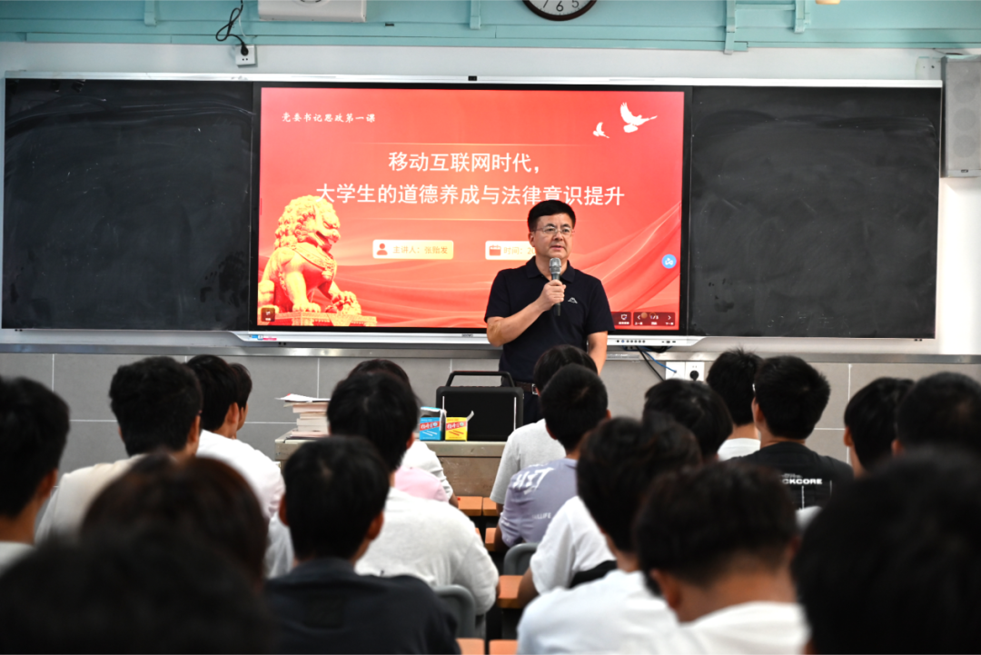 为全面落实立德树人的根本任务,引导大学生坚定理想信念、提升综合素养,近日,学校党委书记张贻发以《移动互联网时代,大学生的道德养成与法律意识提升》为题,为2024级机电3班学生讲授了一堂兼具思想高度与实践指导意义的思政第一课。
